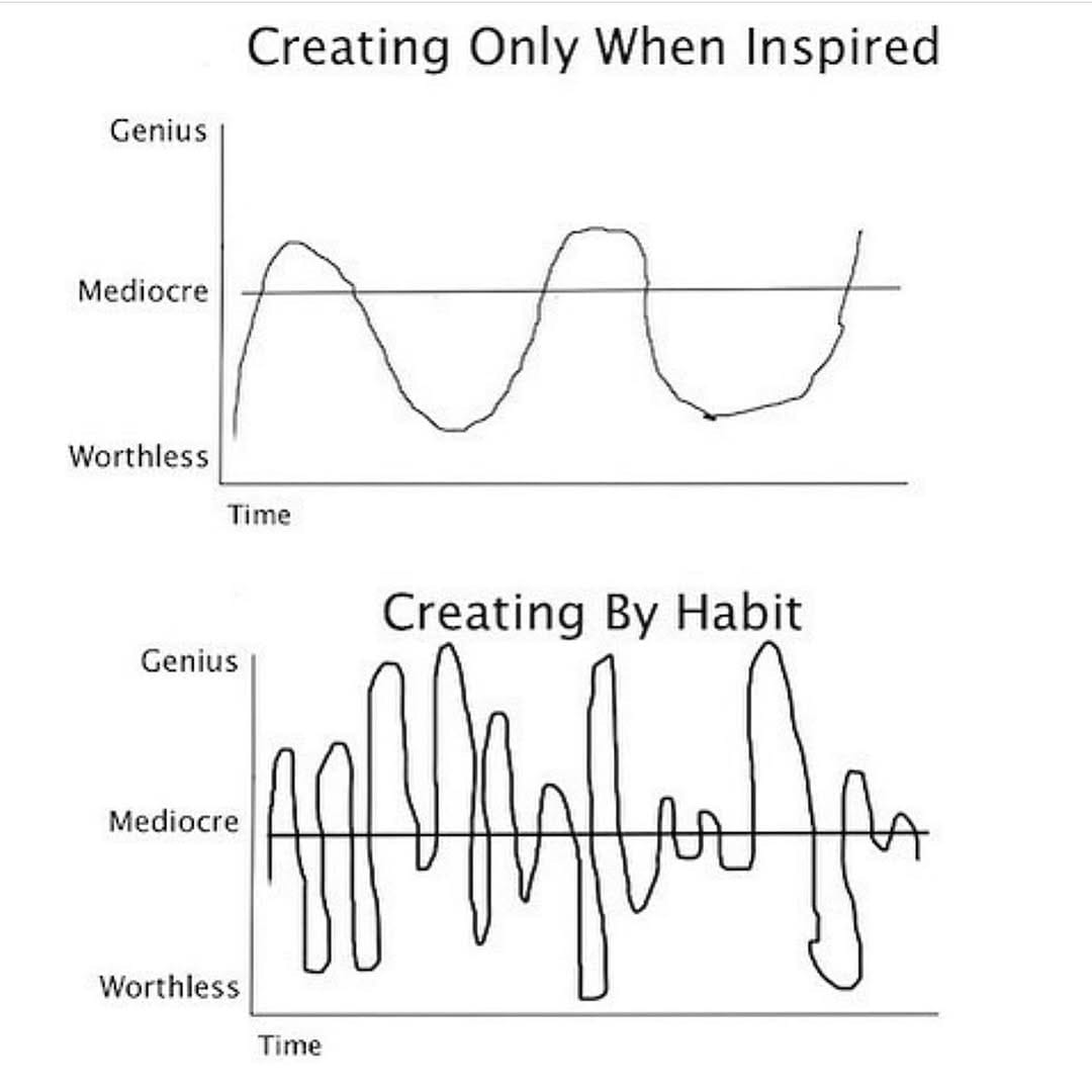 En siis pidä inspiraatiopuhetta erityisen suuressa arvossa. Ainakin, jos "inspiraatiolla" tarkoitetaan jotain sellaista, jonka vain pitää tapahtua ennen kuin luovaa työtä voi edes aloittaa.